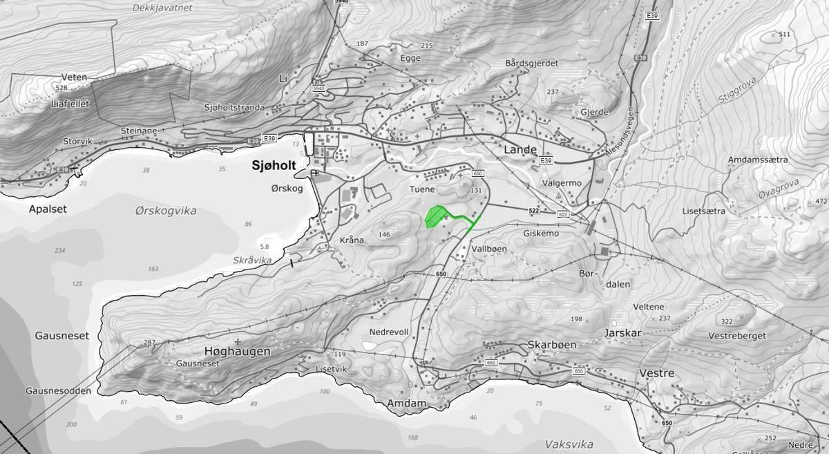 Planområdet markert med grønt på oversiktskartet