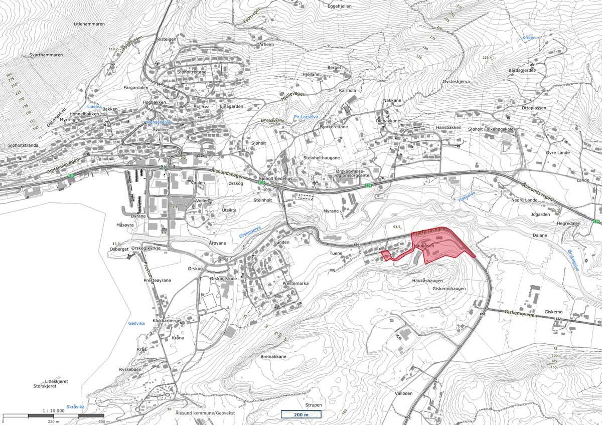 Planområdet markert med raudt på oversiktskartet. Kartutsnitt: Ålesund kommune