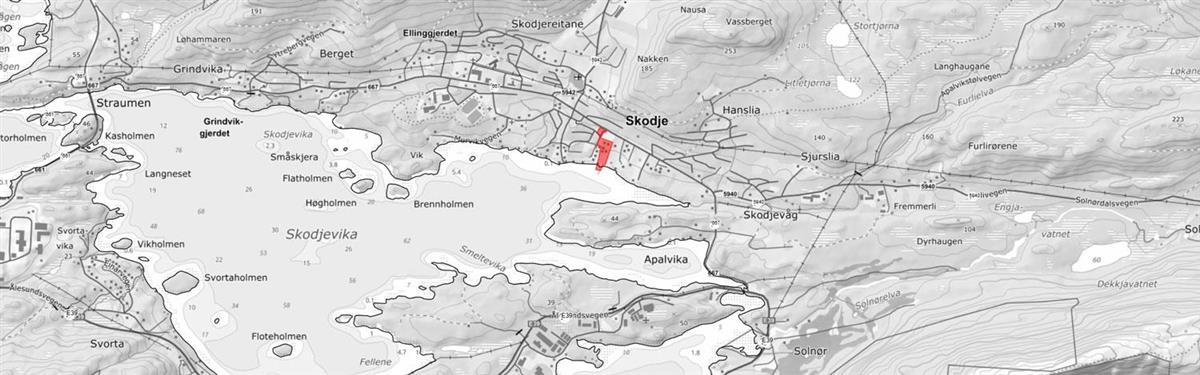 I samsvar med plan- og bygningslova (pbl) § 12-8 blir det varsla oppstart av privat reguleringsplan for bustadar på Skodje. Planid: 202512243. Plangrensa er vist med raudt på oversiktskartet under.