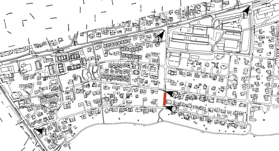 Illustrasjonen viser delen av Yrkesskolevegen som nå blir stengt, som ellers er forbindelse mellom Nylandsvegen og Holsmyrvegen. På denne måten blir det ikke lenger mulig å bruke vegen som snarveg. For noen vil dette være ubeleilig, men kommunen vurderer det som nødvendig i anleggsperioden av sikkerhetshensyn