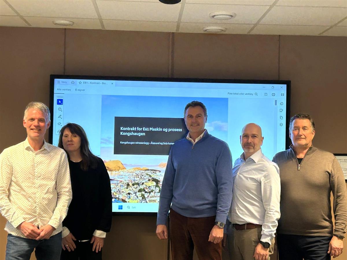 Markering av at siste kontrakt for Kongshaugen reinseanlegg er signert. F.v. Terje Endresen, prosjektleiar, Ingunn Osdal Stette, assisterande kommunalsjef samfunn, Dag Kibsgaard-Petersen, dagleg leiar Biowater Technology, Stefan Kjørvik, Commercial Manager og Jan-Ove Nilsen, Senior Project Manager.