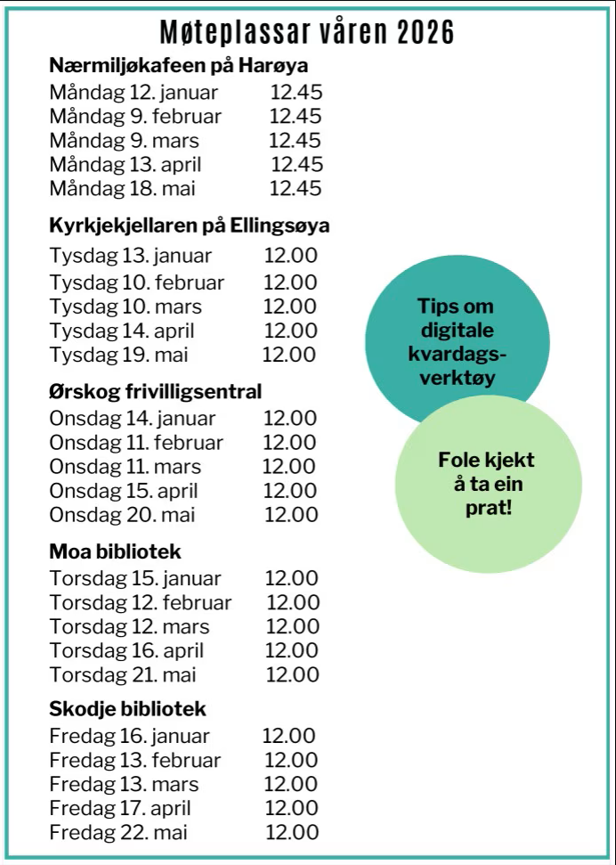 Syns du det er vanskeleg å bruke internett, logge inn i nettbanken eller svare på e-post? Møteplassen "Fole kjekt å vere sosial og digital" er ein møteplass for seniorar der ein over ein kopp kaffi og ein god prat kan lære meir om dei digitale verktøya ein bruker i kvardagen.