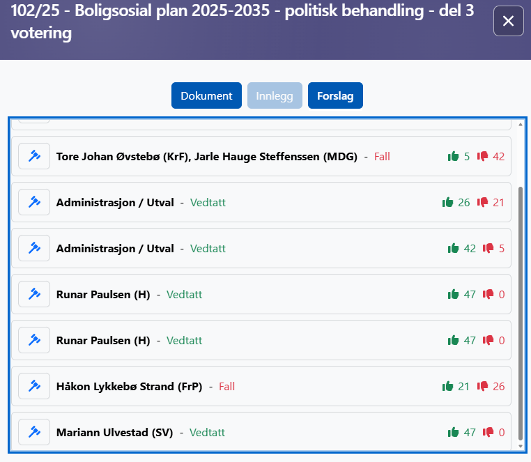 - Vert alle vedtak festa til bokmerke fortløpande, med stemmetal og fullstendig liste over kven som har stemt kva.