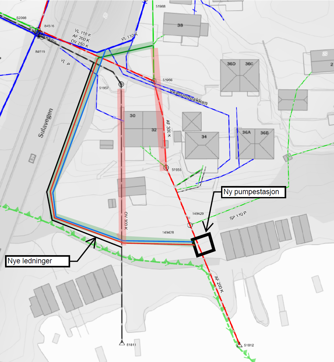 Illustrasjonen viser ei grov skisse over foreløpige planar. Linjene som er markerte med raudt er leidningar som er planlagt sanerte medan dei grøne er planlagte nye leidningar.Dette prosjektet er ikkje ein del av utbygginga på Kongshaugen, men eit eige prosjekt for Ålesund kommune. Prosjektet gjeld pumpestasjon med oppstillingsplass for service- og driftskøyretøy. Dette blir på på kommunal tomt. Pumpestasjonen skal byggast slik at den passar inn i naustmiljøet i området.